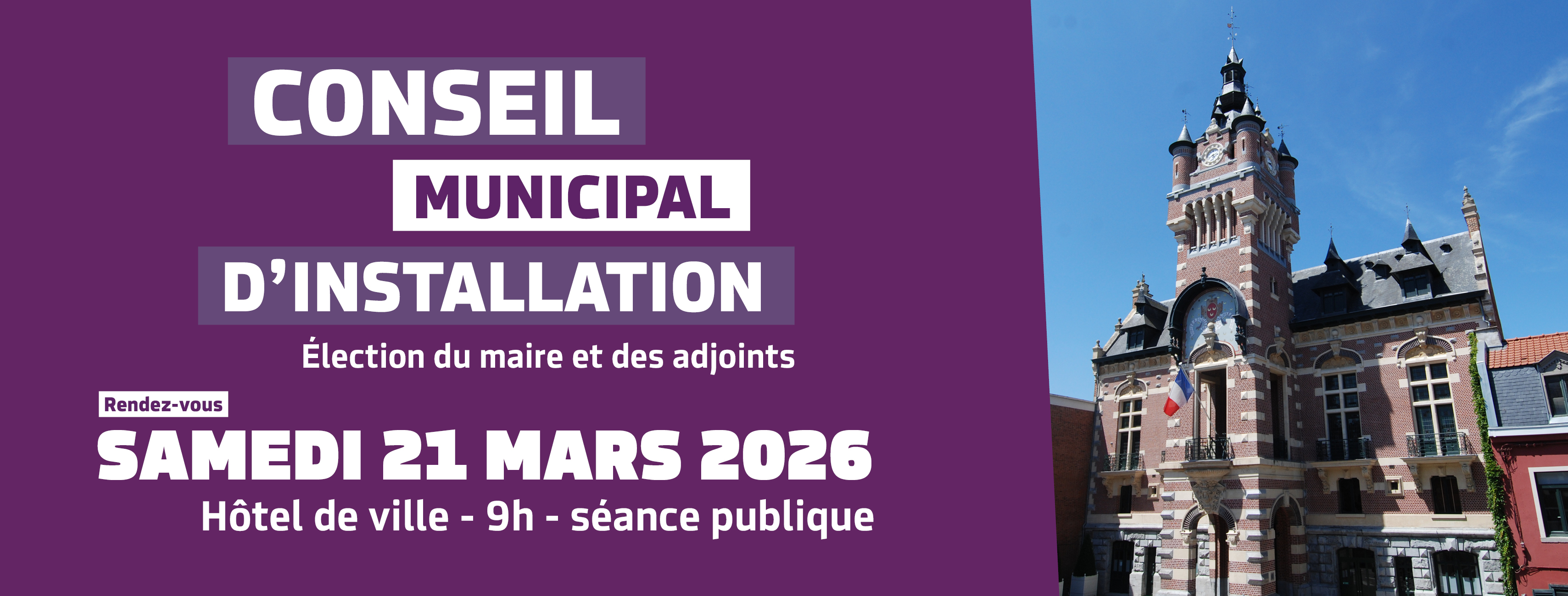Suite aux élections municipales, le Conseil municipal d'installation se tiendra ce samedi 21 mars. Les nouveaux élus se réuniront afin de procéder à l'élection du maire et des adjoints. Ce Conseil sera suivi d'un verre de l'amitié, à partager ensemble dans la salle de restauration de La Fileuse.