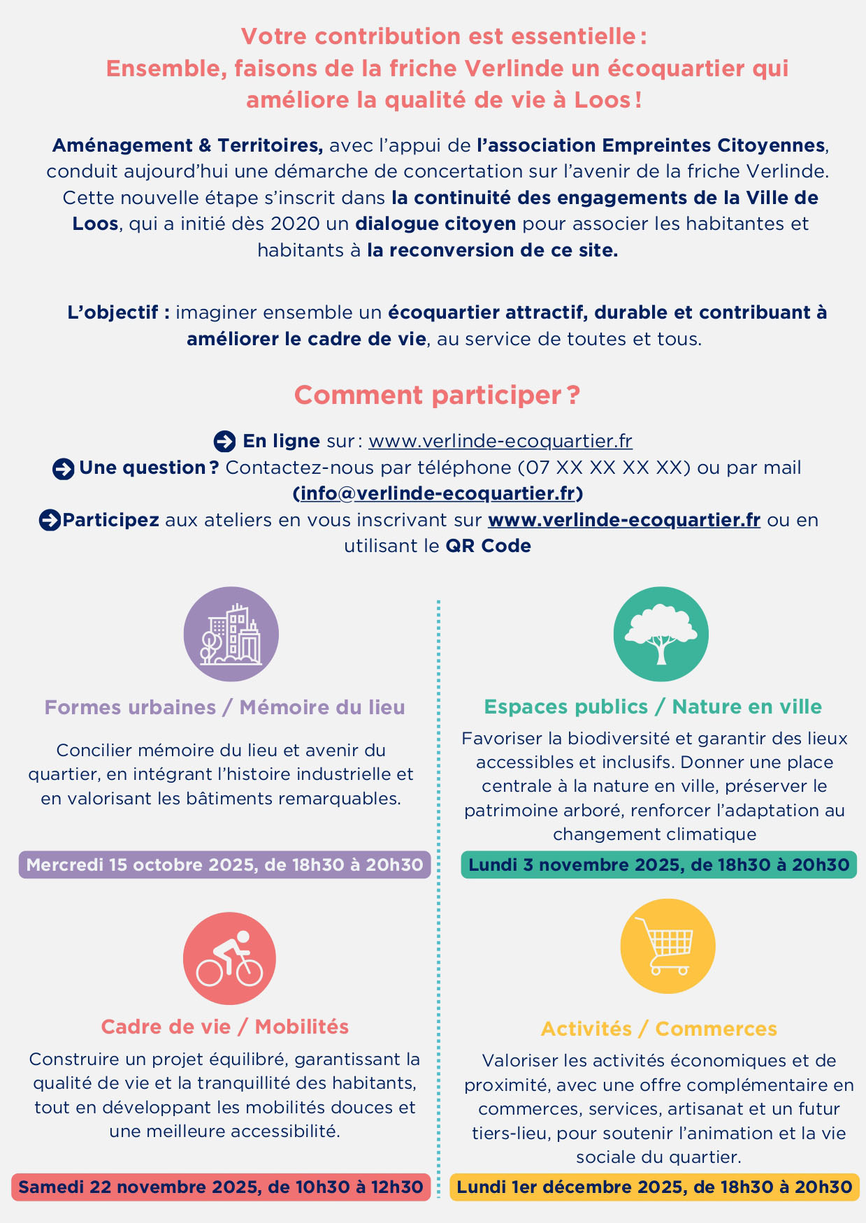 Inscriptions sur www.verlinde-ecoquartier.fr22 Novembre de 10h30 à 12h30 à la Ferme d'Ennequin : Atelier Participatif Verlinde sur la thématique Cadre de vie et Mobilités