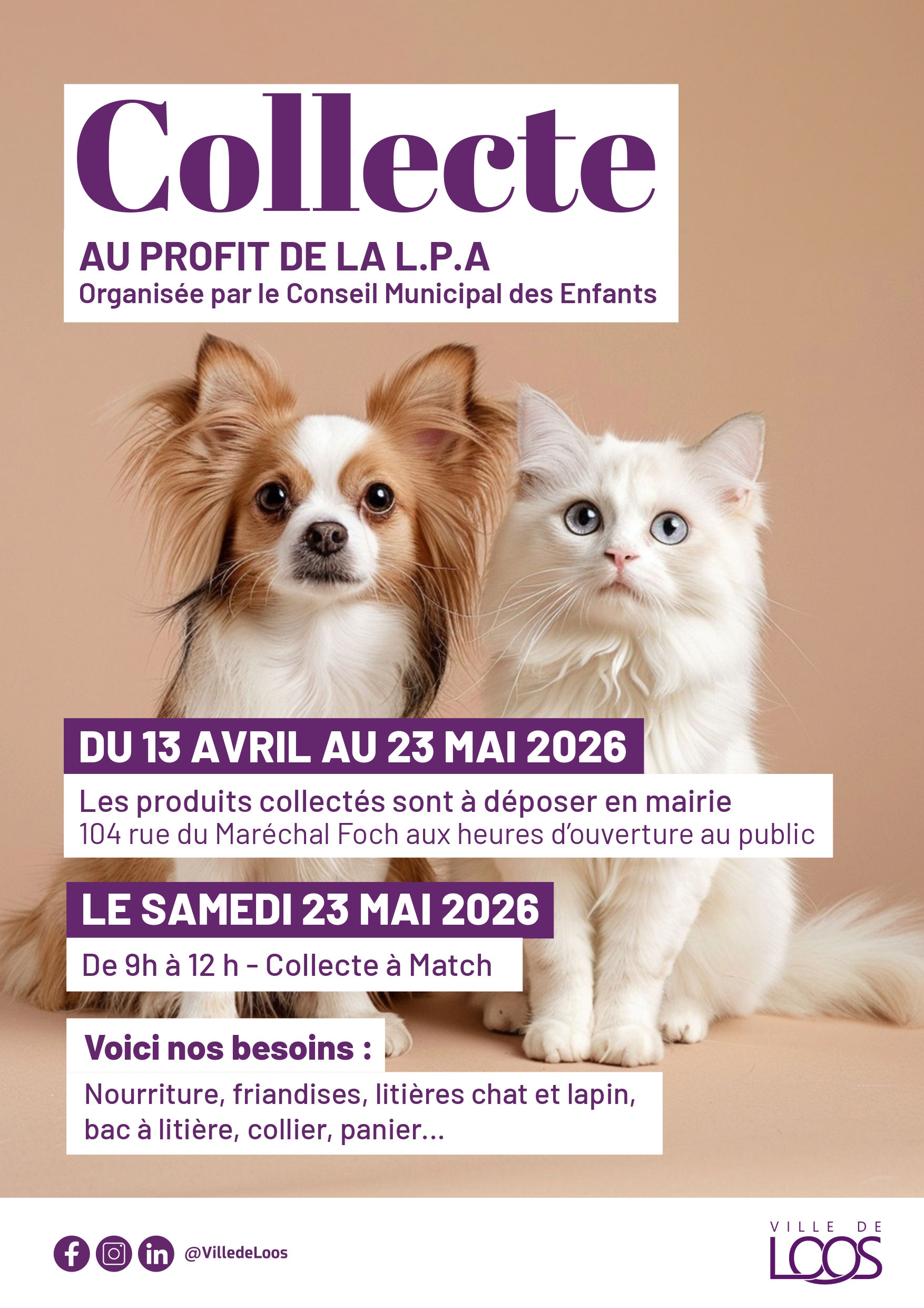 Les élus du Conseil Municipal des Enfants organisent une collecte pour les animaux de la LPA. Cette collecte de denrées et accessoires pour les animaux se déroulera samedi 23 mai 2026, de 9h à 12h, dans le supermarché Match, 92 rue Georges Potié à Loos. Vous pouvez également déposer vos dons à l'accueil de la Mairie du 13 avril au 23 mai 2026, au 104, rue du Maréchal Foch.